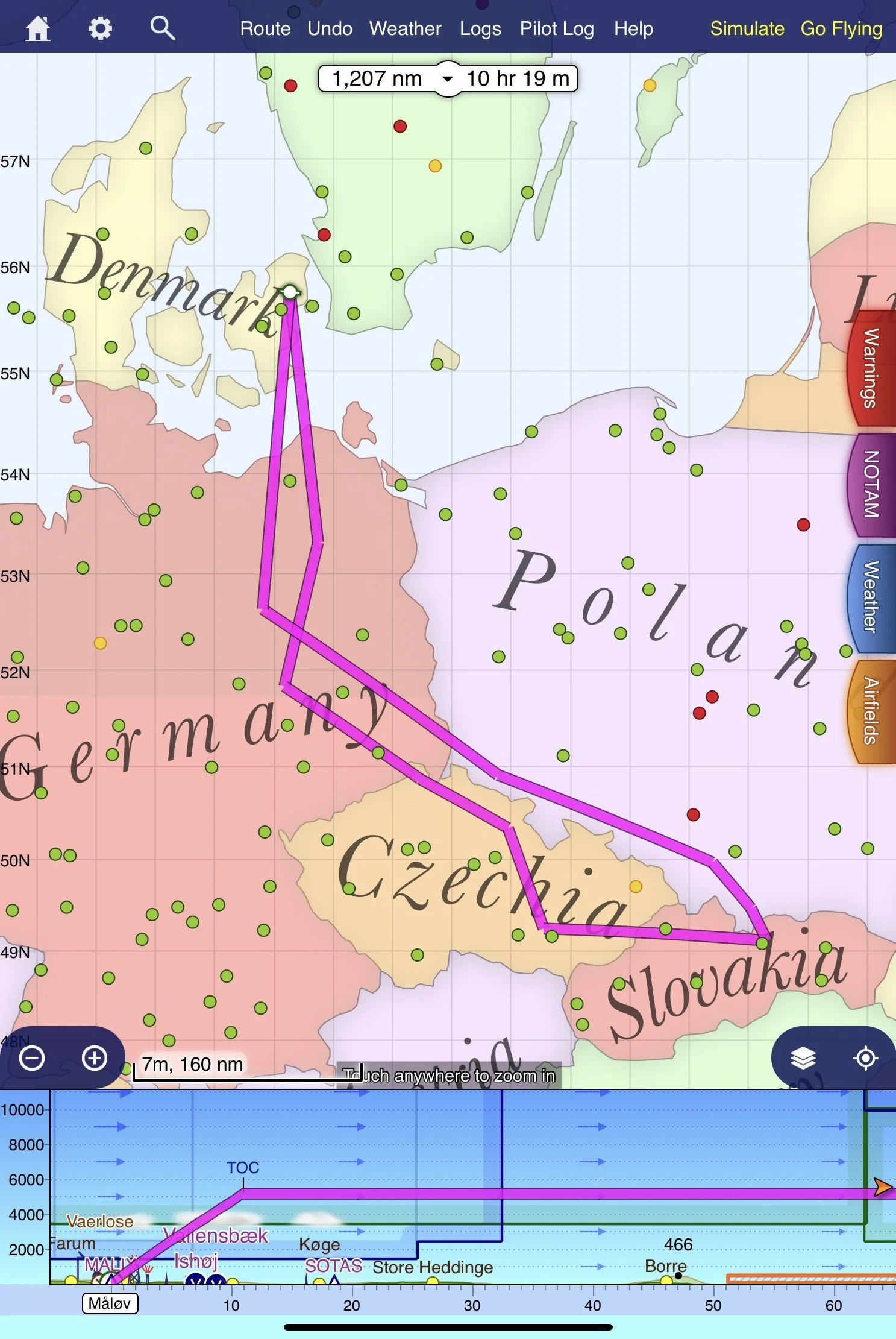 Ja, det skulle naturligvis afprøves, så vi startede ca. 20 fly fra Albatros i Måløv. Vi delte os op i 2 grupper af fly, der fløj nogenlunde samme hastighed, en ”hurtig” gruppe 65 knob (120 km/t) og en langsom 43 knob (80 km/t).